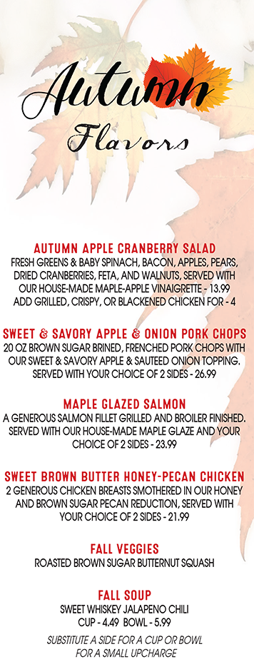 A fresh bed of greens topped with chopped walnuts, dried cherries, red onions, diced pears and apples, and sweet cherry tomatoes with your choice of feta or bleu cheese crumbles.